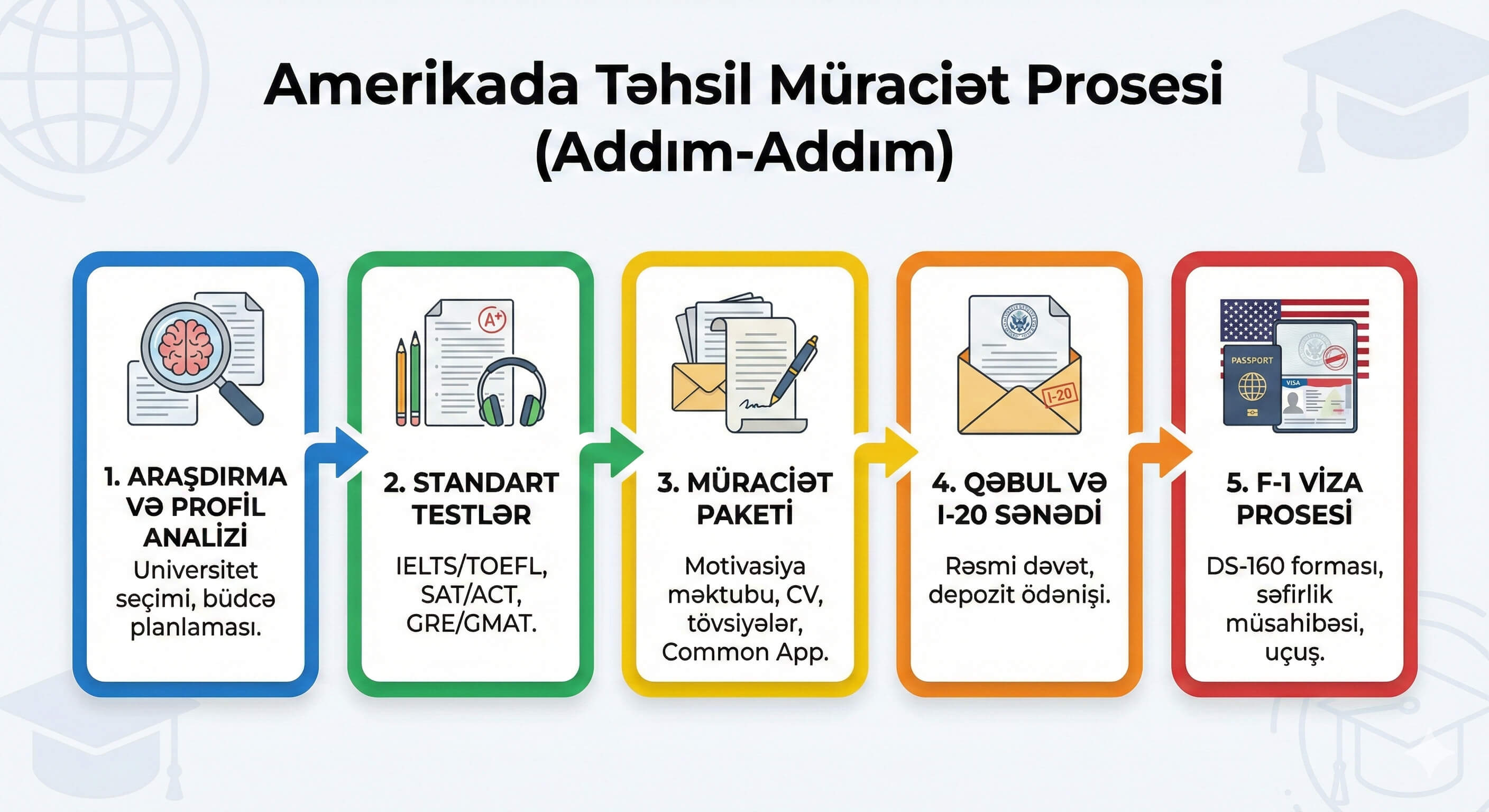 "Amerikada təhsil almaq üçün nə etməli?" sualı hər il minlərlə tələbənin axtardığı cavabdır. Düzgün planlamayla bu proses düşündüyündən çox daha idarəolunan bir yola çevrilir. Əsas mərhələlər belədir: